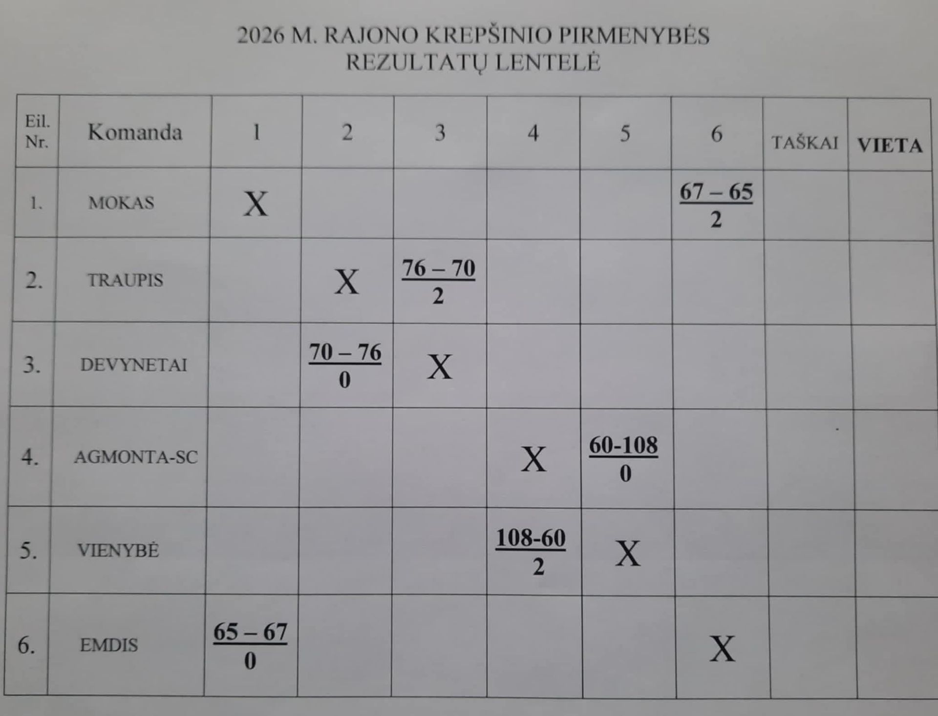 Sausio 10 d. prasidėjo 2026 m. Ukmergės rajono krepšinio pirmenybės. Sužaista trejos rungtynės. Susitiko: ,,AGMONTA-SC“ - ,,VIENYBĖ“, rezultatu 60 – 108 varžybas laimėjo ,,Vienybės“ komanda Rezultatyviausi žaidėjai: ,,Agmonta-SC“ – Ignas Žuklys 24 taškai ir 19 efektyvumo balų, ,,Vienybė“ – Nerijus Gailušis 21 taškas ir 32 efektyvumo balai. ,,DEVYNETAI“ - ,,TRAUPIS“, rezultatu 70 – 76 pergalę džiaugėsi ,,Traupio“ komanda Rezultatyviausi žaidėjai: ,,Devynetai“ – Vakaris Urbonavičius 17 taškų ir efektyvumas -2, po 5 (daugiausia) efektyvumo balų surinko Emilis Mickūnas ir 5 taškai, Karolis Kinčinas ir 9 taškai, Arnoldas Račickas ir 9 taškai. ,,TRAUPIS“ – Tomas Urbonas 28 taškai ir 2 efektyvumo balai, Etgaras Šlaitas 8 taškai ir 18 efektyvumo balų. ,,MOKAS“ - ,,EMDIS“, rezultatu 67 – 65 po atkaklios kovos pergalę išplėšė ,,Moko“ komanda Rezultatyviausi žaidėjai: ,,Mokas“ – Dominykas Želnys 24 taškai ir 13 efektyvumo balų. ,,Emdis“ – Mantas Dūda 20 taškų ir 11 efektyvumo balų. Sekančiosios varžybos vyks SAUSIO 17 D. 10.00 val. ,,MOKAS“ - ,,DEVYNETAI“ 12.00 val. ,,AGMONTA-SC“ - ,,EMDIS“ Visos varžybos vyks ,,Šilo“ progimnazijos sporto salėje (Miškų g. 45, Ukmergė). KVIEČIAME ATVYKTI IR PALAIKYTI SAVO KOMANDĄ