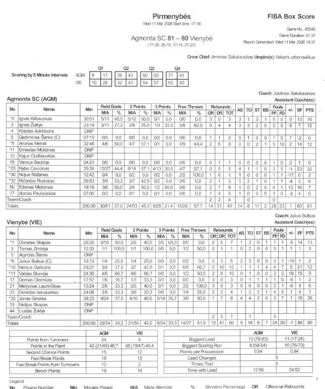 ,,Agmonta-SC“ – Nytas Cesiūnas - 32 taškai ir 23 naudingumo balai, Aironas Melnik įmetė 12 taškų ir surinko 14 naudingumo balų.