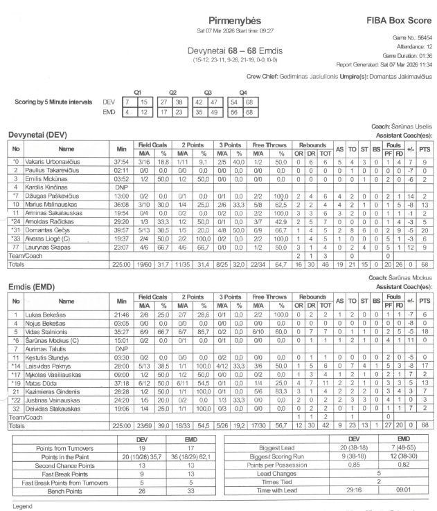 ,,Emdis“ – Vidas Stalnionis įmetė 18 taškų ir surinko -5 naudingumo balus, Laisvidas Paknys įmetė 17 taškų ir surinko -8 naudingumo balus.